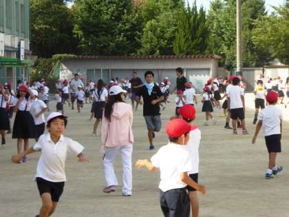 「2回戦は、先生方が鬼です!!」の発表。一転、必死になって走り回り、子どもたちにタッチ。朝からちょっとハードかも・・・