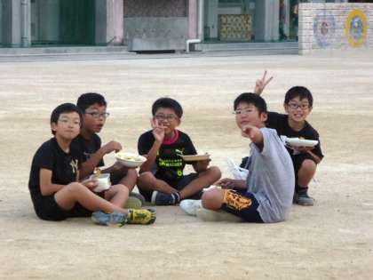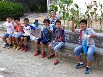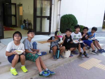 自由に広がってみんなで夕食。運動状のど真ん中で、カレーなんてこの時でなければできない経験(笑)。