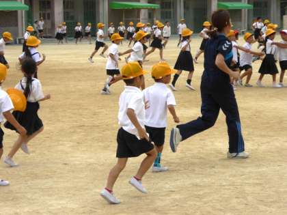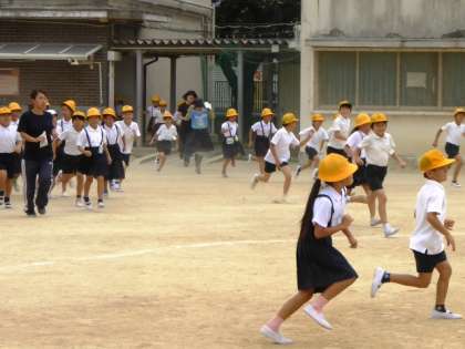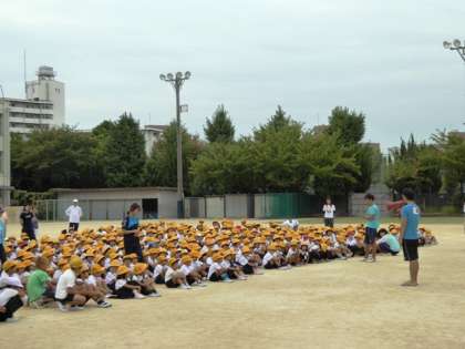 (1・2枚目)先生の指示で運動場に集合、すぐに人員点呼です。