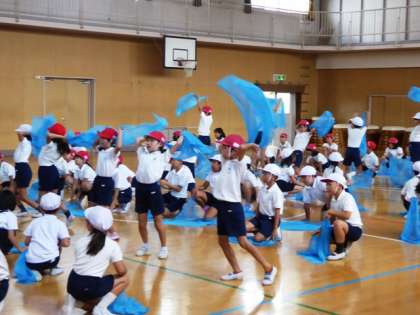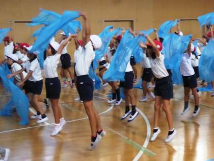 新体操のリボンのように、ひらひらと布をたなびかせて移動しながらの演技です。全員がピタッとそろえばきれいでしょうね。