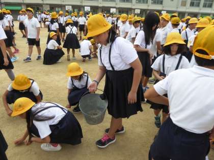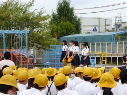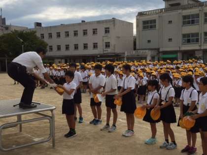 天候は幸い崩れず、いつも通り運動場のでの朝会です。