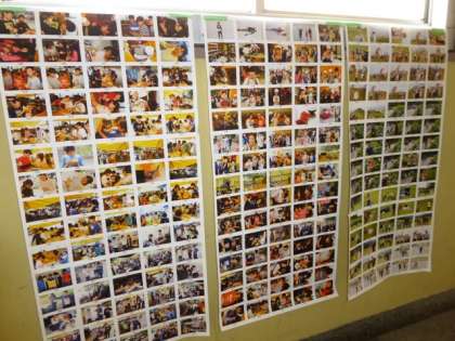 5年生の廊下に写真屋さんが撮影した「林間学習」の見本写真がたくさん貼られています。