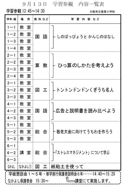 子ども達の頑張りを応援してあげてください。なお、学習参観の後、1年から5年は学級懇談会、6年は修学旅行説明会予定していますので、奮ってご参加下さい。