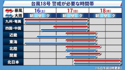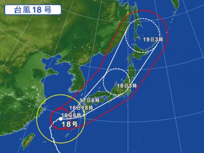 台風18号は、日本列島を縦断、近畿直撃のコースを進んでいます。