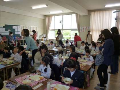 担任の先生から、給食のめあてや正しい食事のマナーや姿勢のお話しの後、みんなでそろって「いただきます」