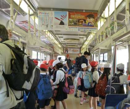 出発時にぱらついた雨が嘘のよう、はれ上がった絶好の遠足日和、3年生は大阪環状線一周と大阪城への遠足に行ってきました。