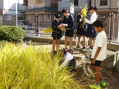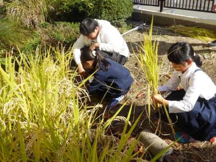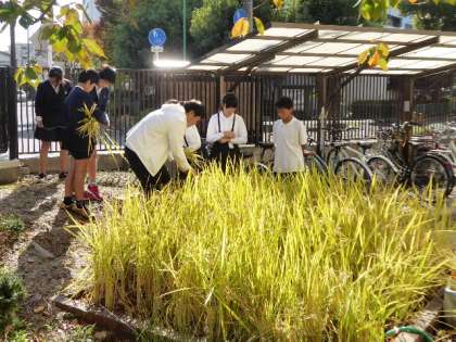 ビオトープ横の水田で育てていた稲が豊かに実り、今日「稲刈り」を行いました。今年は長雨が続いたために、ほぼ1か月遅れの稲刈りです。