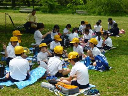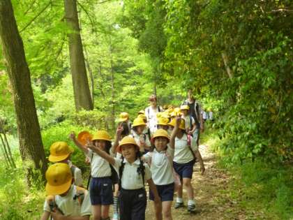 子ども達も疲れているはずなのに、「この後はお弁当ですよ〜」という先生の声に、一挙にパワー回復。またまた森の中の小道を元気に歩き続けました。