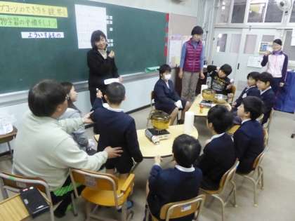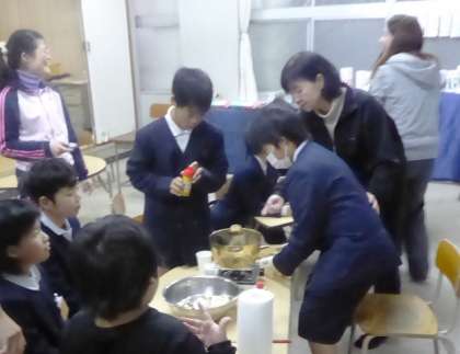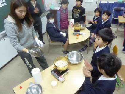 ポップコーンが音をならしてできあがっていくのにみんな興味津々、先生の指示に従って、てきぱきと動いていました。