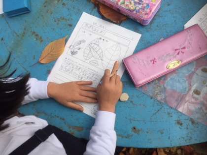 子ども達は色づいた落ち葉や枯れ枝など、目についたものの手触りや色を観察して気付いたことをプリントにていねいに書きこんでいました。