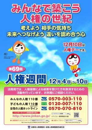 今から69年前の1948年12月10日、第3回国際連合総会で「世界人権宣言」が採択されました。それを記念して、12月10日を含む一週間を「人権週間」と定められました。