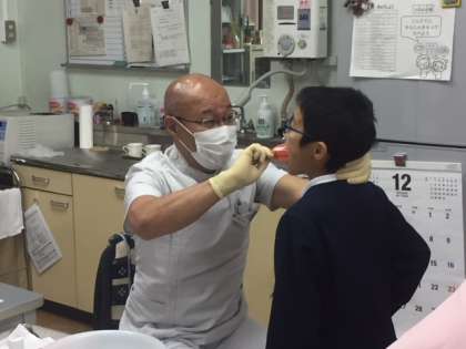 実際に歯磨きをして実践した後、歯科校医の田路先生からフッ化物の塗布をしていただきました。
