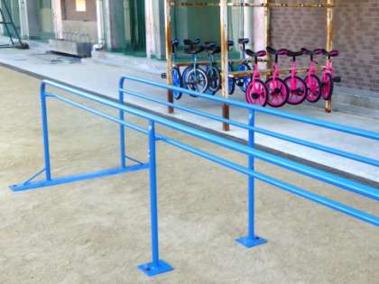 手前の青いポールは、その一輪車の「練習台」です。慣れるまではこの