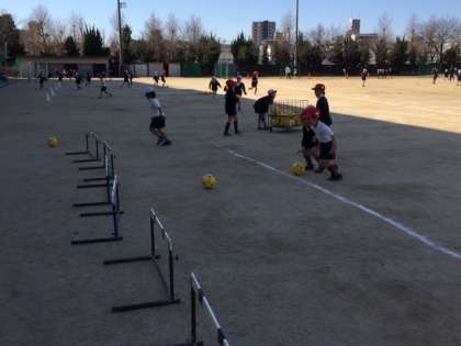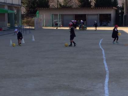 寒さ厳しい中、運動場では1年生が学年合同体育を行っていました。