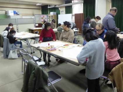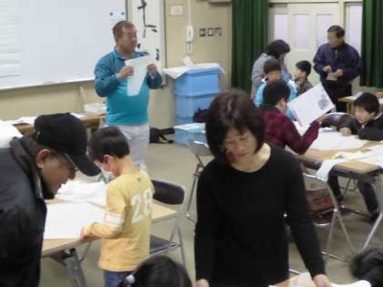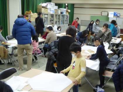会場の多目的室は、子ども達だけでなく地域や保護者の方々でいっぱい、作成するのは、和紙と竹を使った本格的な「和だこ」です。
