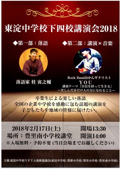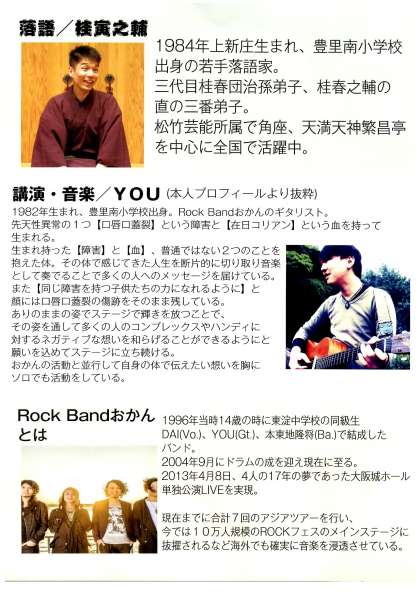 落語家の桂寅之輔さんと「ロックバンドおかん」のギタリストYOUさんをお招きして、落語や講演・演奏で楽しいひと時を過ごしていただく企画です。