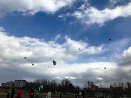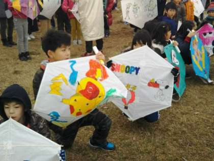 前日の雨で足元が心配されましたが、お天気も回復して、いい感じの風も吹き、東淀川区内からたくさんの児童が集まり、自作の凧揚げに挑んでいました。