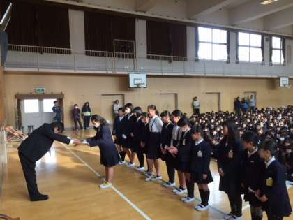 今朝は珍しく、冷え込んだ講堂での集会です。