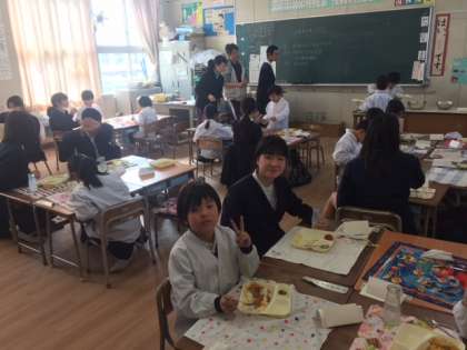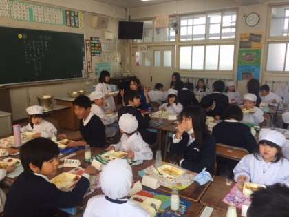 先日、インフルエンザによる学級休業のため延期になっていた1年生と6年生の交流給食が実施されました。今日のメニューは「ポークカレーライス」。ほとんどの子どもたちが好きなメニューです。