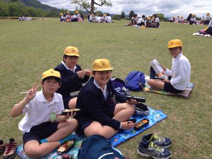 昼食を食べていると外国からの観光客が子ども達に興味深々で近づいてきました。お弁当や遠足、集団行動に興味があったようです。中国からの方々でしたが、子ども達は「ハローハロー」(笑)