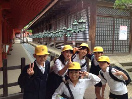 昼食の後は班ごとに分かれて奈良公園内の春日大社、若草山、二月堂をオリエンテーリングしました。どの班も予定より早くゴールして、競争と勘違いしたのでは??しっかり日本の文化にふれることができたでしょうか。いやいや子ども達はちゃんと日本の文化を伝えています。「神社の敷居をふんだらあかんで。敷居は親の頭やで」こんな会話が交わされていましたから。