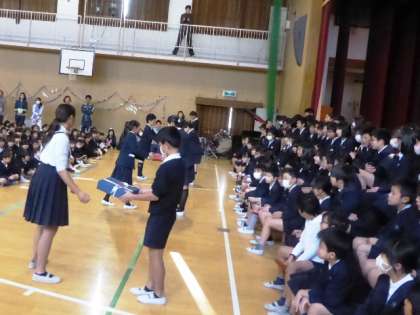 3枚目:在校生からの記念品授与(分団員の寄せ書き)