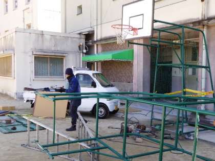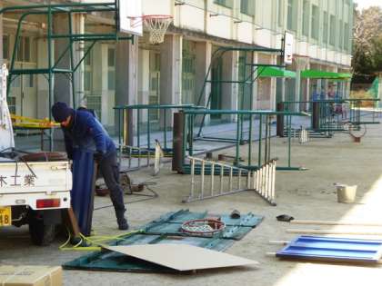 動きが悪くなった移動用ローラーを修理し、古くなったバスケットボードやリングを新しいものに付け替えています。