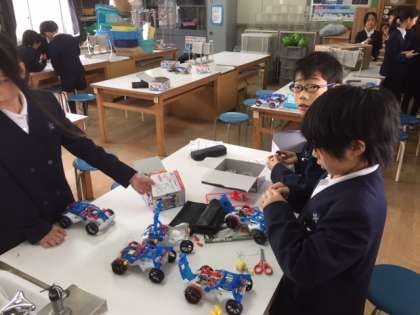 電磁石をモーターとして組み込んだ「ロードスター」を制作し、廊下で走らせ大はしゃぎ。