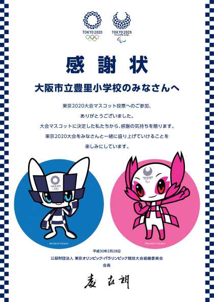 先月に、本校の全学級で行った東京オリンピック・パラリンピックのマスコット投票の感謝状が東京オリンピック・パラリンピック競技委員会から届きました。