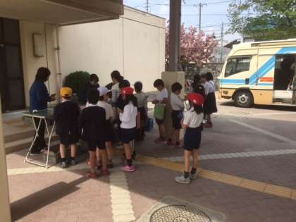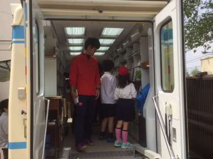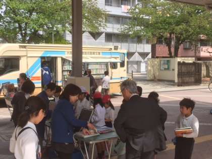 本を選んで借りる子ども達や地域の方々に交じって、今日は校長先生も初めての自動車文庫を見に来て、さっそく貸出カードの申し込みをしていました。