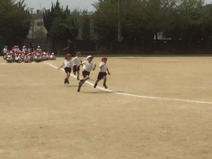 そして、最後は4人ずつでトラックを半周走りました。来月はスポーツテストもあります。記録がぐんと伸びるといいですね。 (教務)
