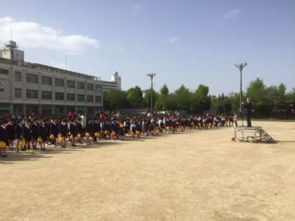 4月16日(月)、明け方の冷え込みが少し緩んだ運動場で今年度初めての「児童朝会」がありました」