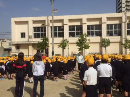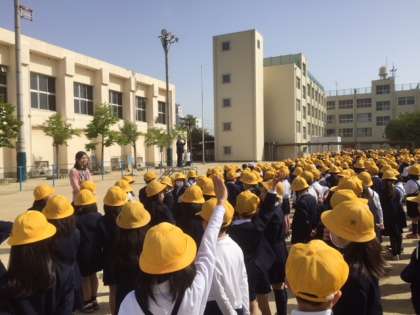 1年生にとっては、小学校生活初の朝会で、担任の先生に連れられて運動場に出たものの、何が起こるのか不安げな表情でした。