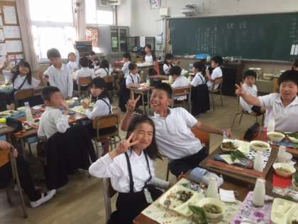 ↓4年2組の給食の様子です。給食、おいしいですか?