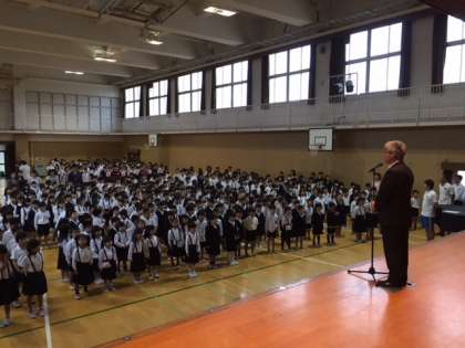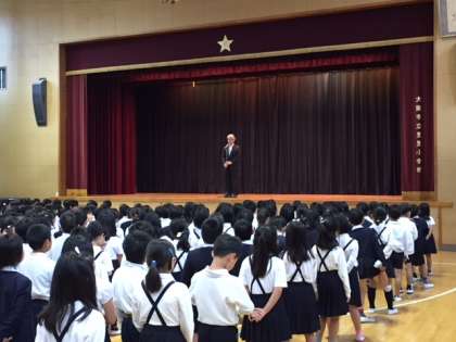 講堂で児童朝会を行い、学校長より「いじめ」について