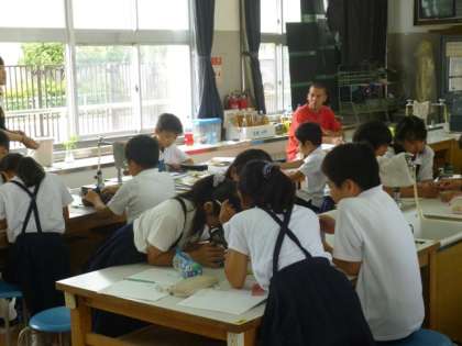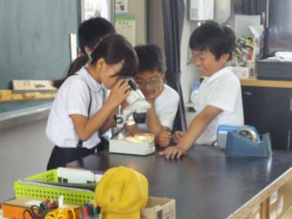 各班に1台の顕微鏡、受精したメダカのたまごを順番に観察します。
