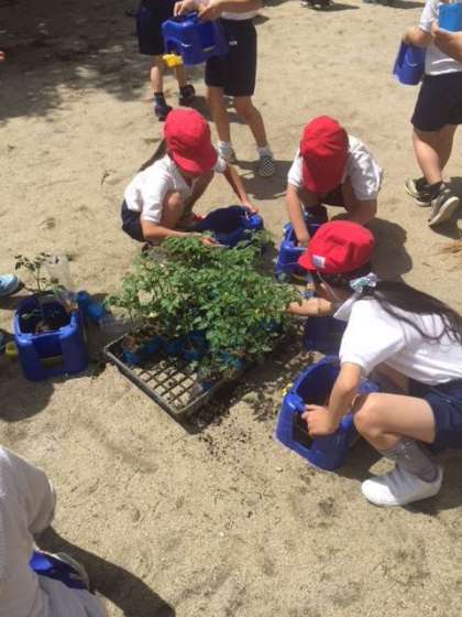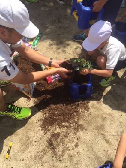今日は苗植え! 先生に手伝ってもらってプランターに植えました。