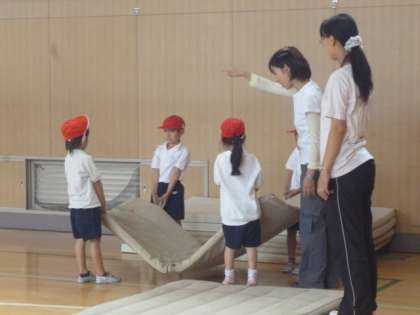 子ども達がけがをせずにマット運動に専念できるよう安全なセッティングを学びます。