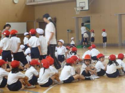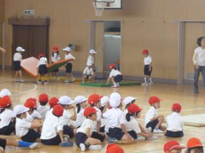 合同体育ですが、初めてのクラスもあるようで、「マットの運び方」からの指導です。