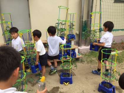 4時間目の学習園、2年4組が生活科で育てているミニトマトのお手入れです。