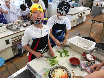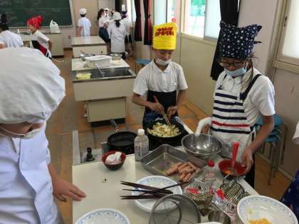 包丁の扱いに気をつけて、野菜やウインナーを切ったり、炒めた野菜を卵で器用に包んだりと役割をきちんと分担して行うグループもありました。
