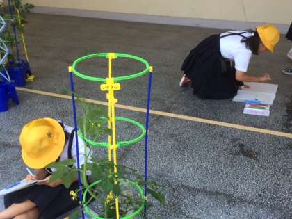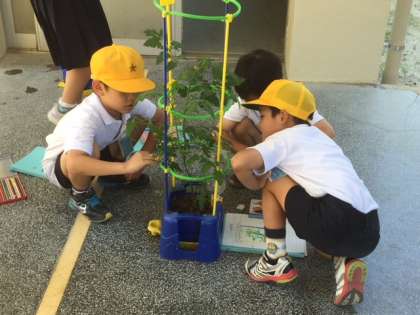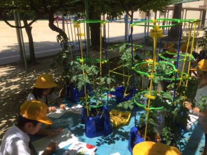 2年生は、生活科の学習で育てているミニトマトの観察をしていました。