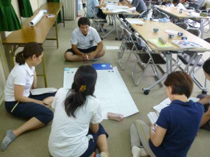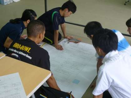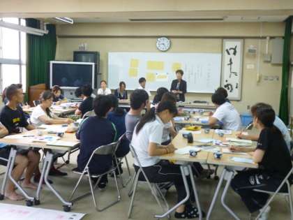 その後、グループに分かれ、当日の「指導案(教案)」をもとに、【課題】と【成果】を話し合っていきます。【課題】は青のポストカードに、【成果】はピンクのポストカードに書かれ、拡大された指導案に貼り付けます。
