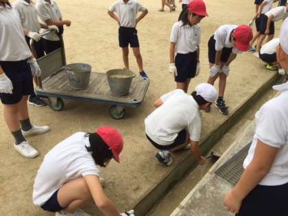 重たい重たいバケツの運搬も、男子だけでなく女子もがんばってくれ、きれいになっていく側溝を見て満足そうな表情でした。