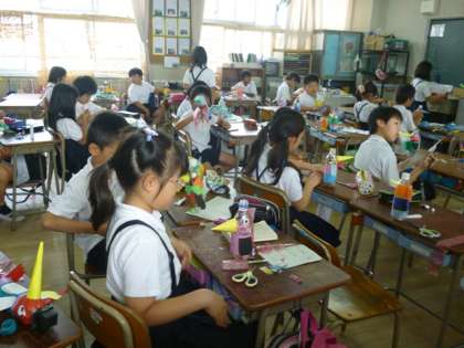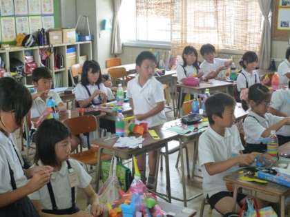4年生の図工、ペットボトルで作る「不思議な鳥たち」です。