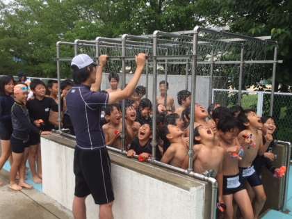 5年生名物…シャワーを浴びながらの「ブルブルブルブル ブルドック」の大合唱 (教務)