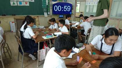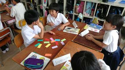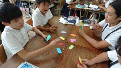 最後に、Paul先生が「Lucky color! 〜 」そのカードを持っている子どもたちから歓声が上がりました。タイマーを使って2分間のゲームなので、みんなしっかりと会話をして時間内にフィニッシュしました。 (5年)