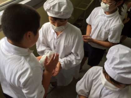 手洗い石けん係の健康委員会児童に石けんをつけてもらい、しっかり