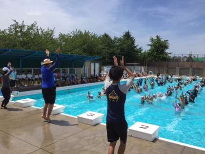 1年生と6年生がプールサイドに整列すると200名越えで、プールサイドが子どもでいっぱい・・・