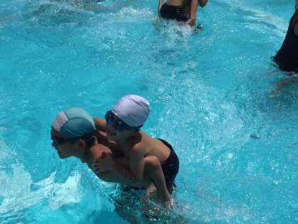 1年生をおんぶしてプールを1往復、次に1年生の手を引いて1往復。